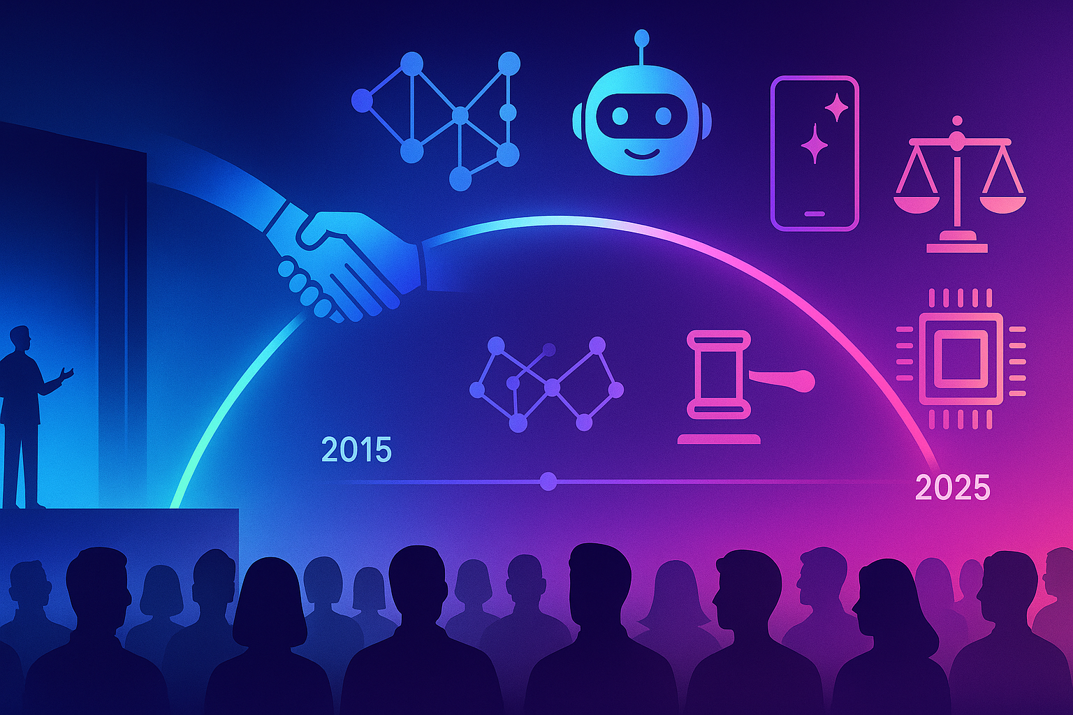 This era set the tone for “AI as a spectacle.” A high-profile human-vs-machine match in early 2016 turned a specialized research milestone into global television. In 2017, a new attention-based architecture reshaped how models are trained, celebrated onstage and in hallway conversations alike. Tech events began treating research talks like product launches: big ideas, live demos, instant lore.