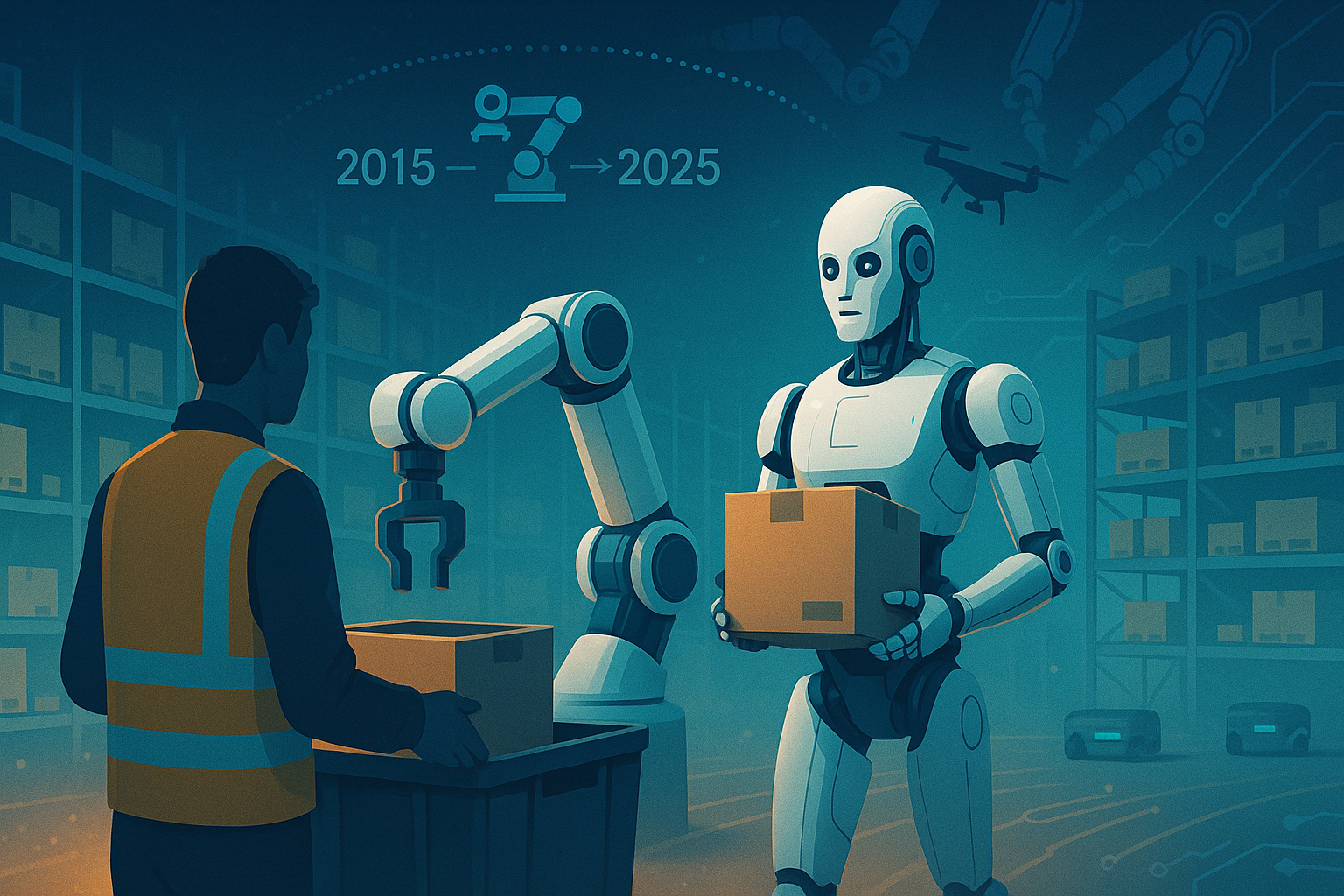 Logistics became the first environment where mobile platforms, robot arms, and increasingly bipedal formats paid off at scale. Over the decade, deployments jumped from a few thousand mobile robots to hundreds of thousands. New storage systems, AI-driven pickers, and bipedal platforms began tackling dull, repetitive tote-handling tasks.