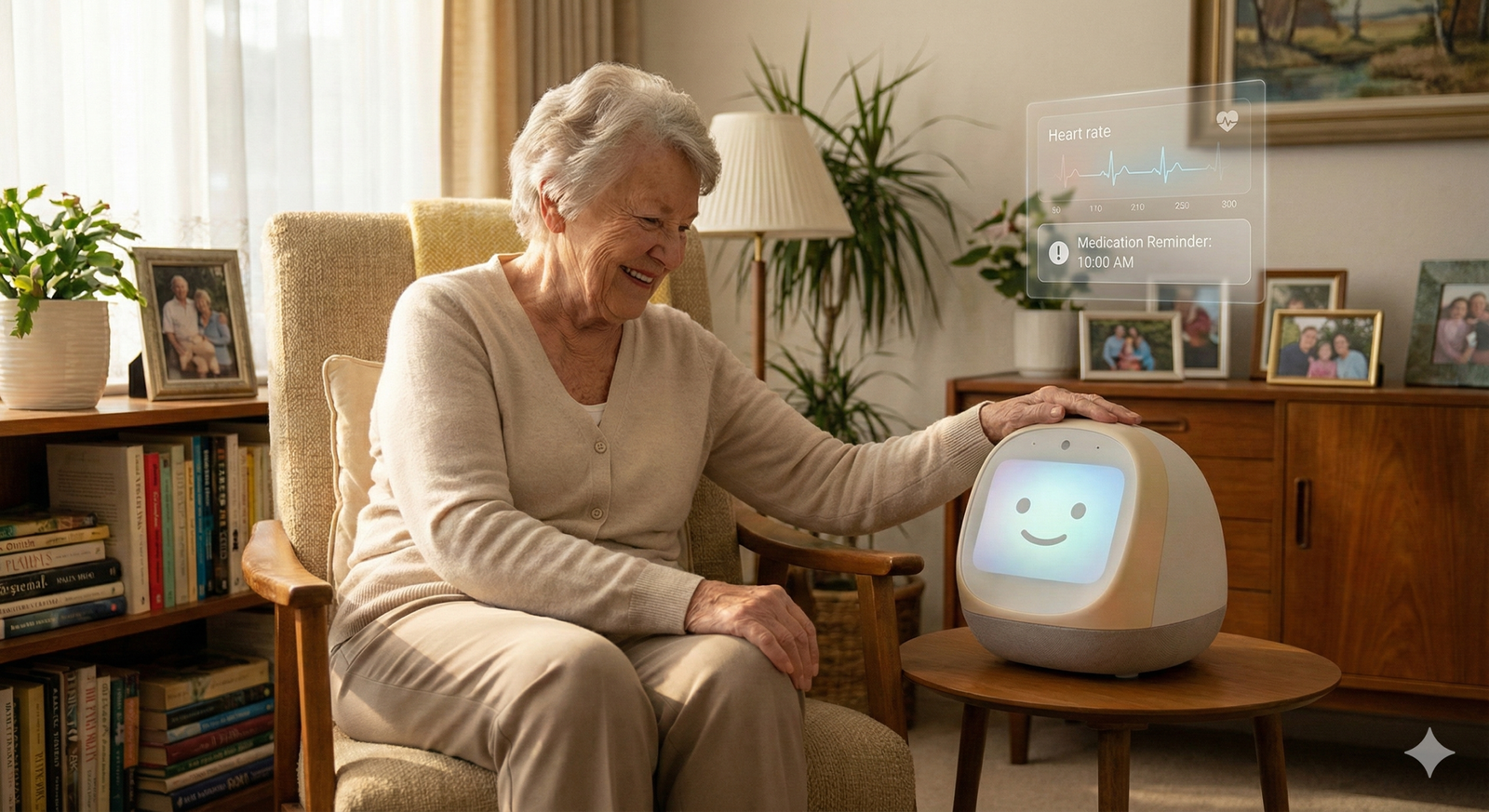 A smart speaker (like Alexa) is reactive; it waits for a command. A care companion is proactive; it initiates conversation, reminds you of appointments, suggests activities, and checks in on your mood without being prompted.