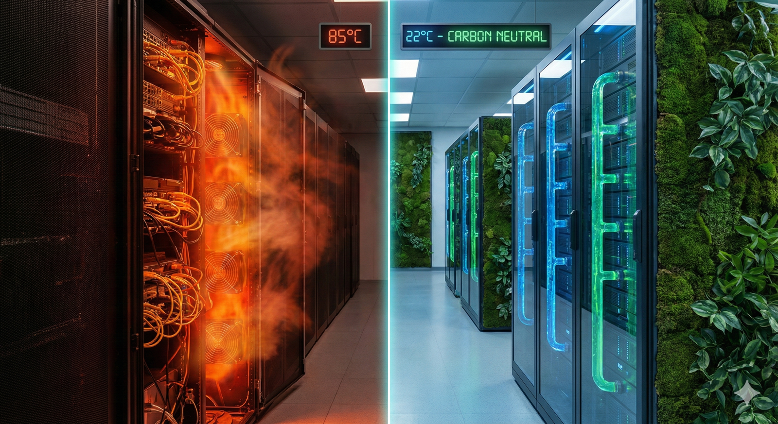 AI chips run hot—significantly hotter than standard web servers. Traditional air cooling (huge air conditioners blowing cold air through raised floors) is reaching its physical limit and is incredibly wasteful.