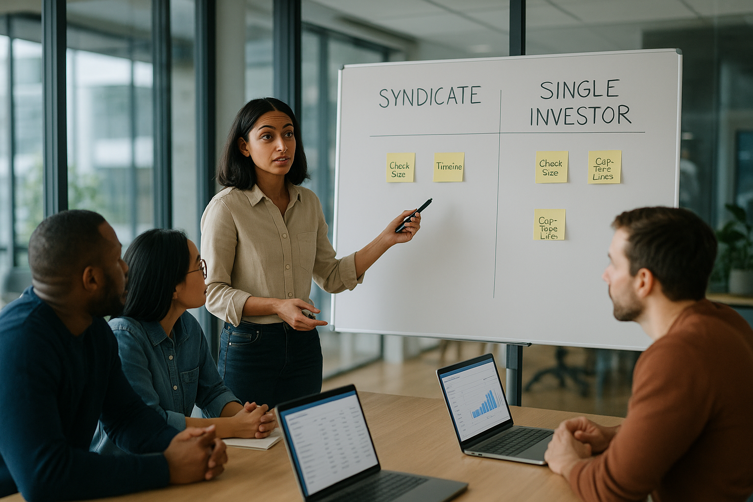 Choosing between syndicates vs single investors is less about fashion and more about fit. In one line: a syndicate aggregates many angels into a single Special Purpose Vehicle (SPV) that invests as one line on your cap table, while a single investor writes one check and is your clear point of contact. You’ll make a better call by lining up your round size, speed requirements, governance needs, cap table strategy, and follow-on plans against the trade-offs below. Quick path: (1) size your target and minimum viable close, (2) decide whether you need a lead or just capital, (3) set guardrails on cap-table lines and pro-rata allocations, (4) pick the instrument and jurisdiction, and (5) choose the route that gets you to a clean, timely close with future rounds in mind. This guide is educational, not legal or financial advice; consult qualified counsel for your specific situation. Done right, the choice here can shorten your timeline, reduce administrative drag, and position your next raise.